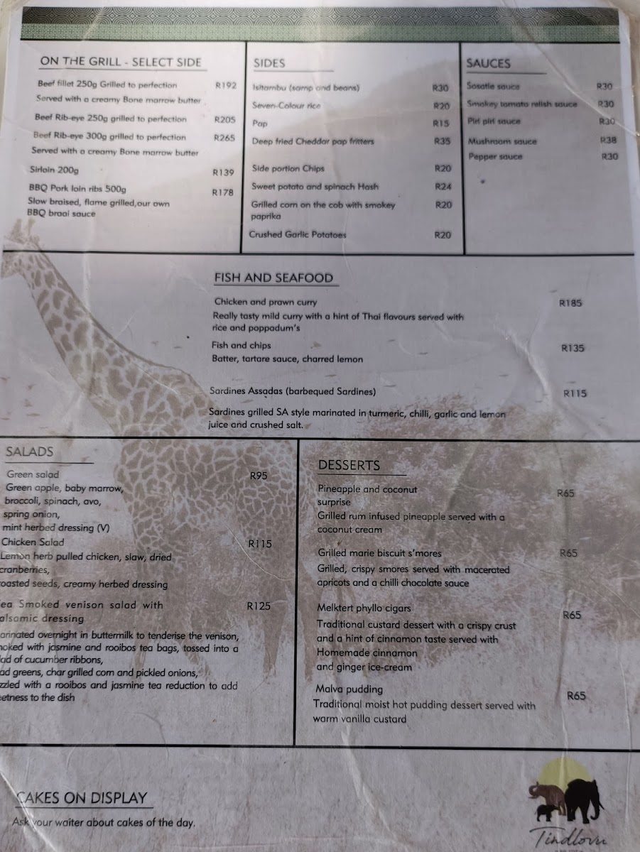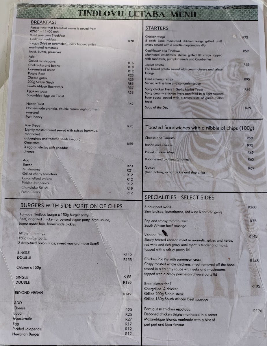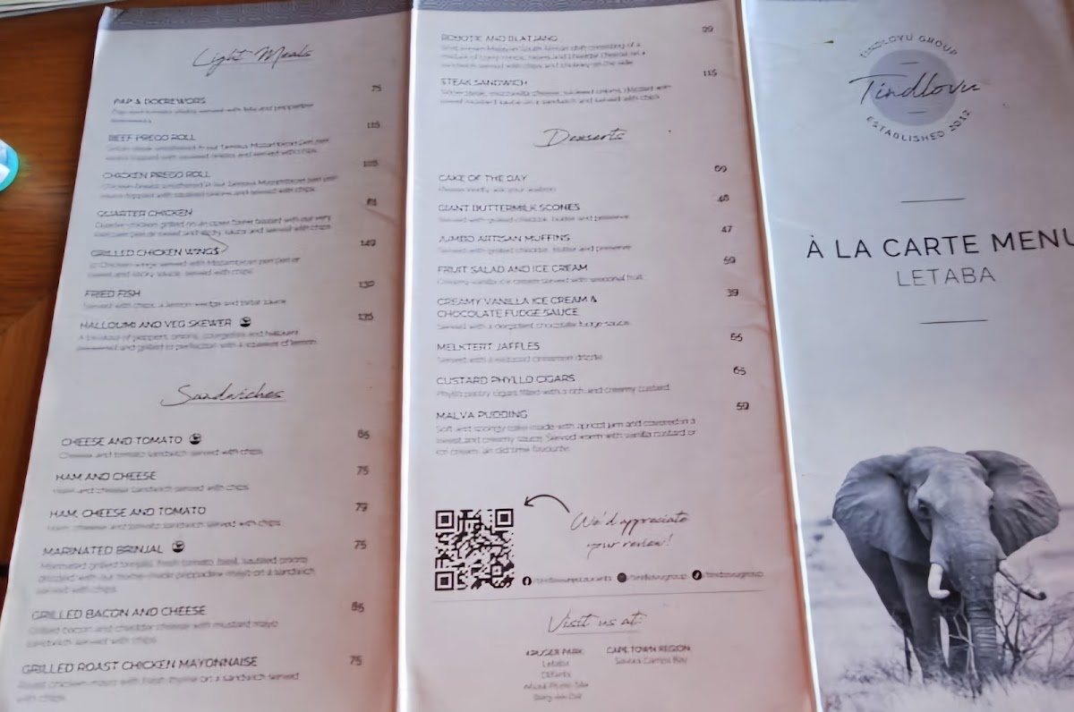 The menu features a diverse array of options that cater to every palate, ensuring that dining at Tindlovu is not just a meal, but an unforgettable part of your safari adventure.