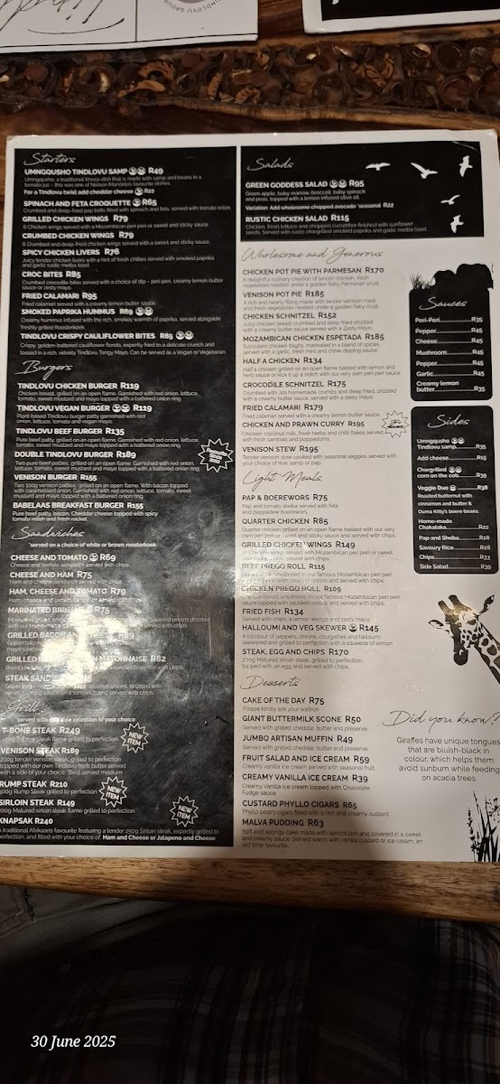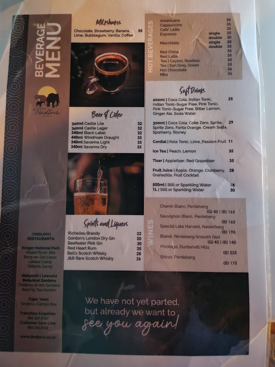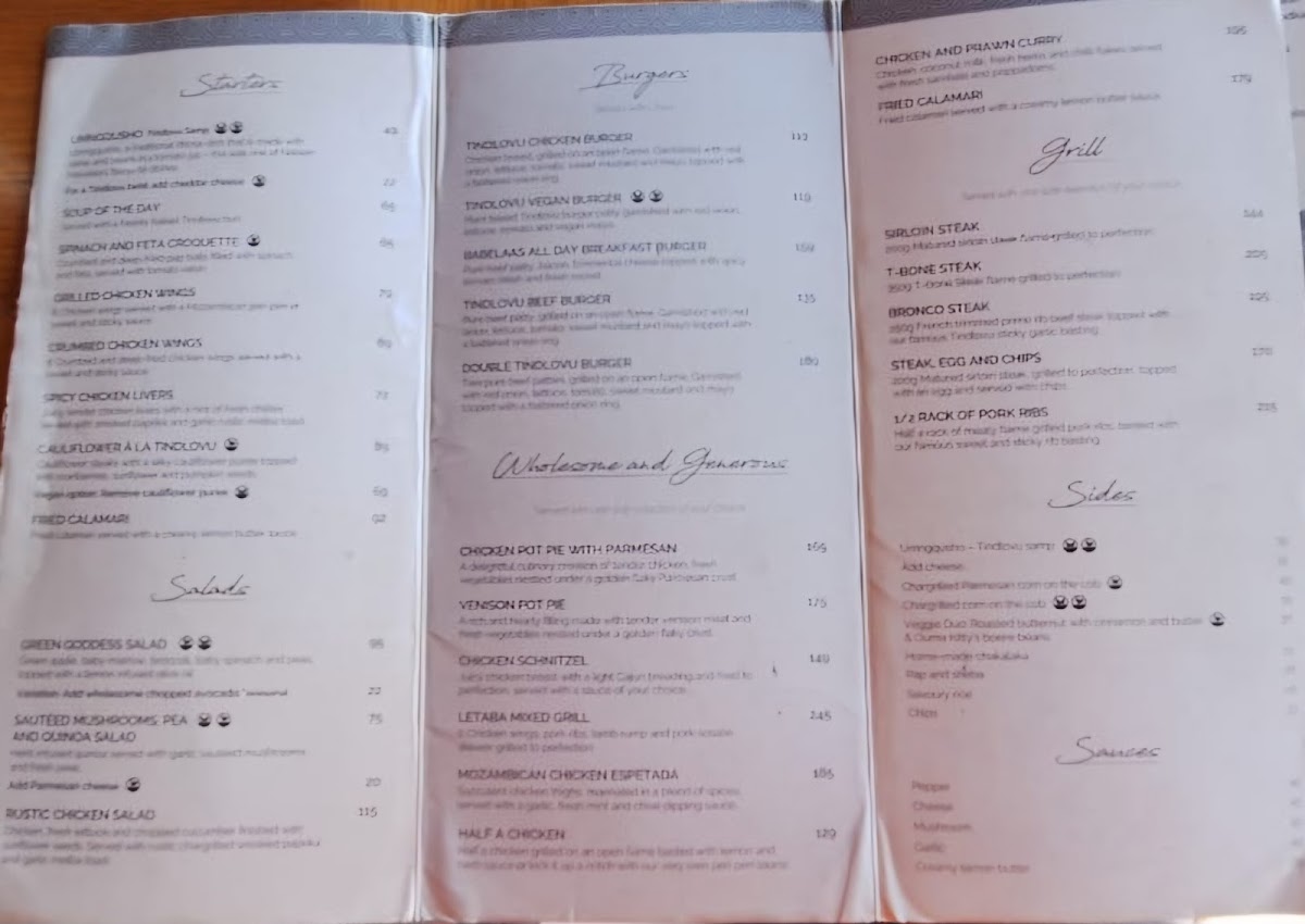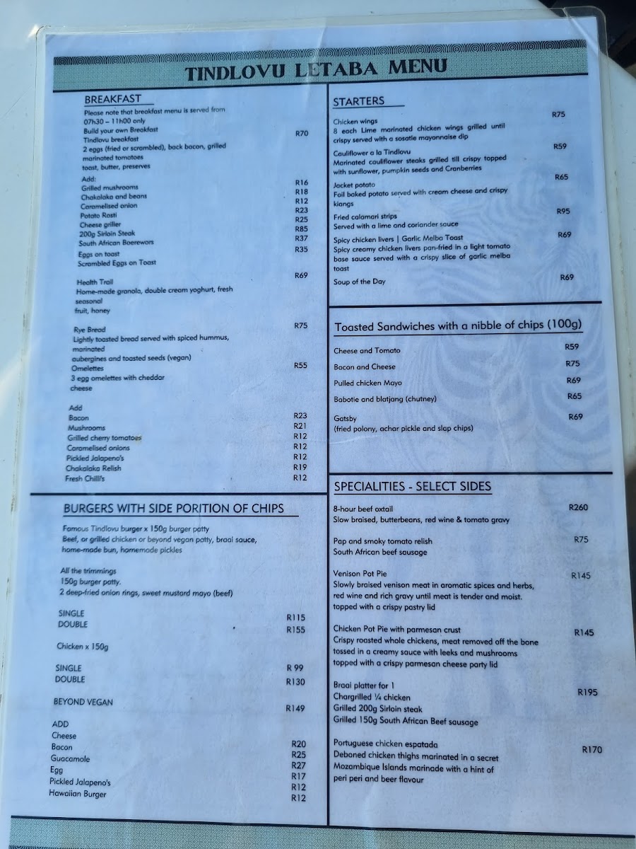 The menu features a diverse array of options that cater to every palate, ensuring that dining at Tindlovu is not just a meal, but an unforgettable part of your safari adventure.